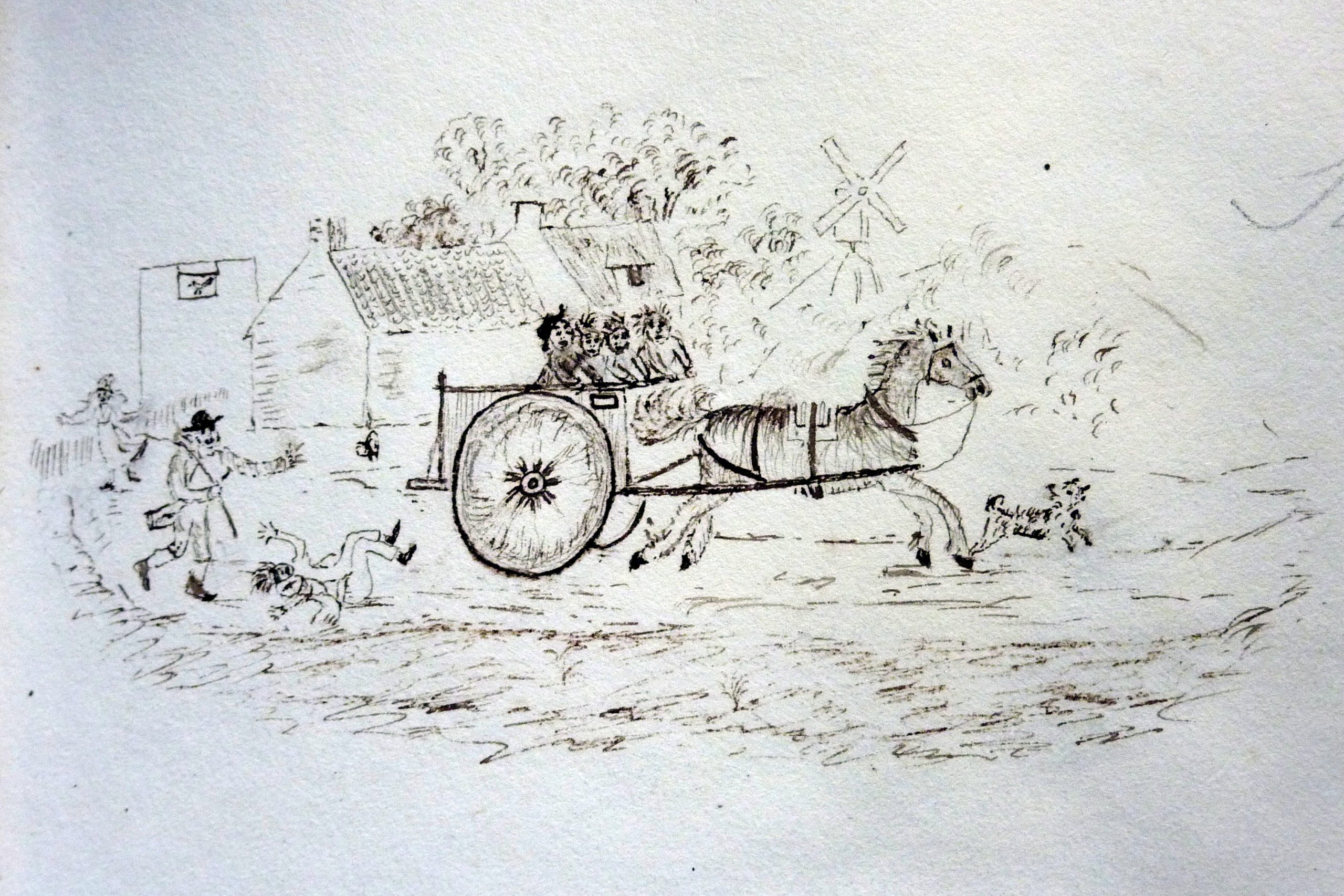 Sarah’s view of her sister’s driving is shown in her humorous sketch of the family cart in action (Possibly passing the Cock Inn at Polstead)