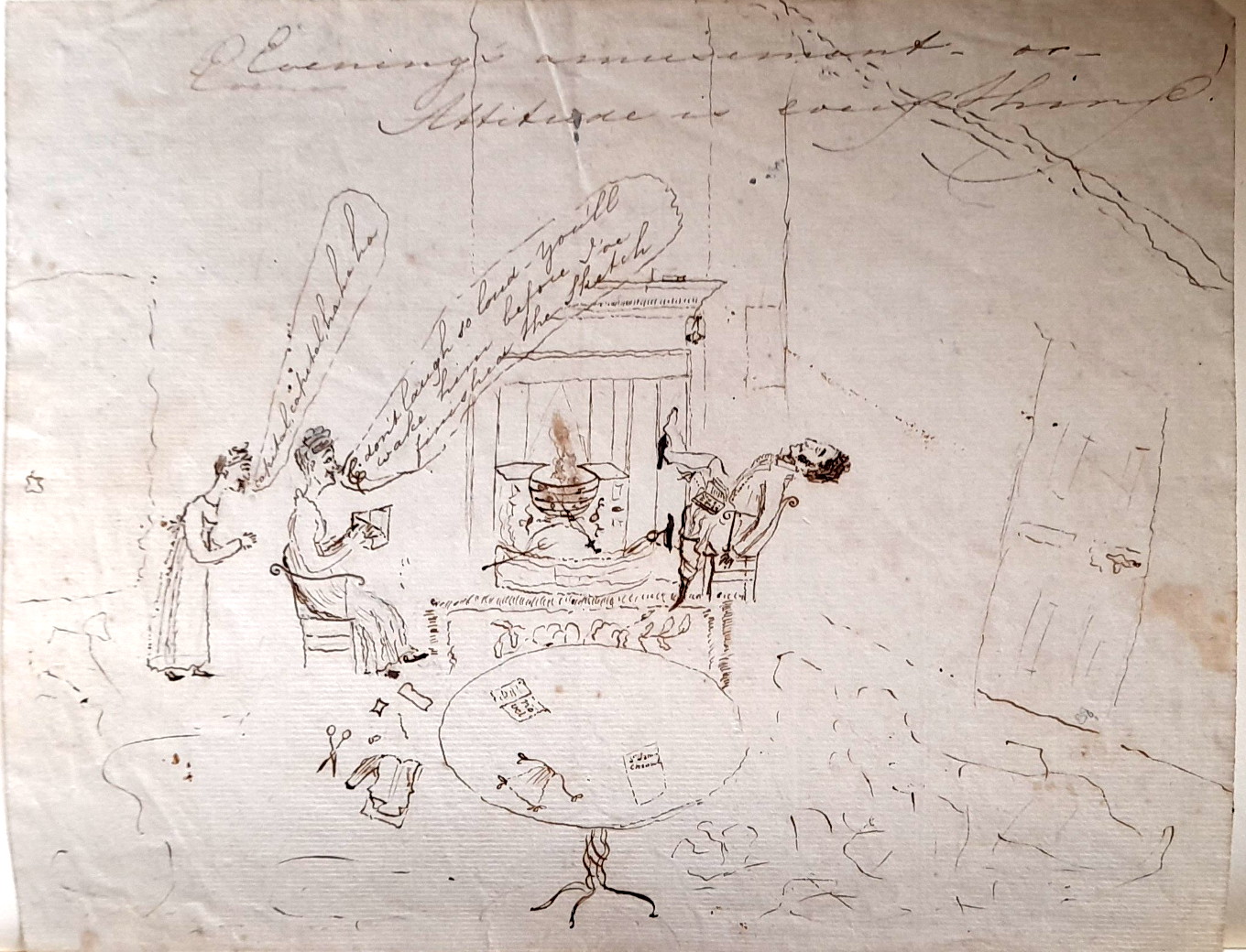 Sarah offers a snapshot of domestic life. Another version of the drawing labels the artist in the picture as Sarah herself, approached by her younger sister Charlotte, while she draws Samuel as he sleeps by the fireplace. Sewing materials lie about, while the reading matter on the table is identified as a “Novel” and the newspaper “St James’s Chronicle”.