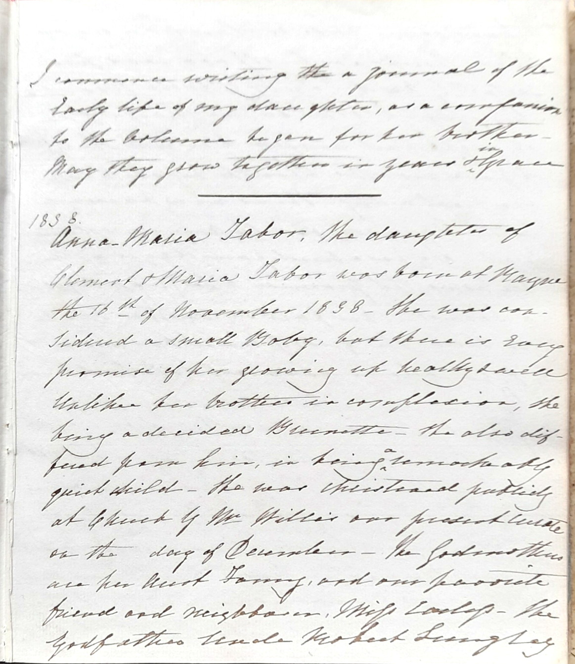 Anna Maria Tabor, the daughter of Clement and Maria Tabor 1 was born at Rayne the 16 th of November 1838 – She was considered a small Baby, but there is every promise of her growing up healthy and well Unlike her brother in complexion, she being a decided Brunette – she also differs from him in being a remarkably quiet child – She was christened publicly at Church by Mr Willis 2 our present curate on the day of December – the Godmothers are her Aunt Fanny, and our favourite friend and neighbour Miss Carless – the Godfather Uncle Robert Lungley