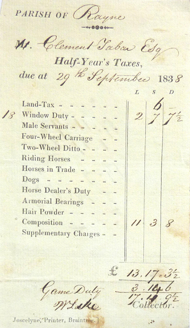The 1838 bill shown here is for Assessed Taxes, falling under the Board of Stamps and Taxes. Payments would have been gathered by one of the Collectors appointed by a parish Assessor, himself appointed by a District (or Division) Commissioner. Taxes were still being paid half-yearly at this time. Notably, the due date for payment is shown as 29 th September. This is is Michaelmas Day, one of the traditional Quarter Days (the others being Lady Day, Midsummer Day, and Christmas Day) which had long been associated with payments of rent and other debts. This is despite the fact that the official beginning of the tax year had been moved 11 days from the traditional March 25 th date of Lady Day to April 5 th in 1752/3 -adjusted a further day in 1800 – in response to Britain’s move from the Julian to the Gregorian calendar.